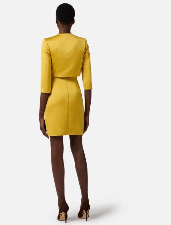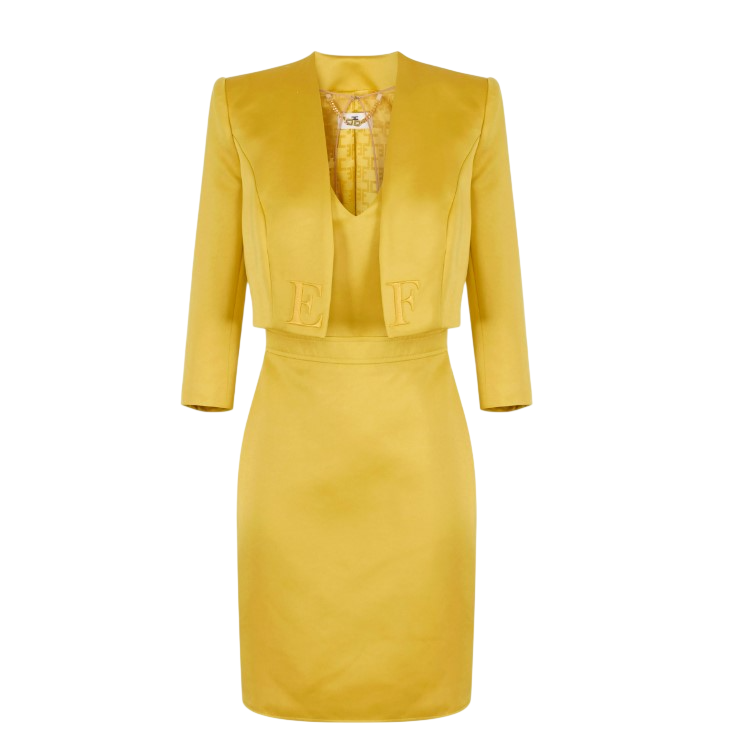 - Matching jacket with structured shoulders and tailored cuts.